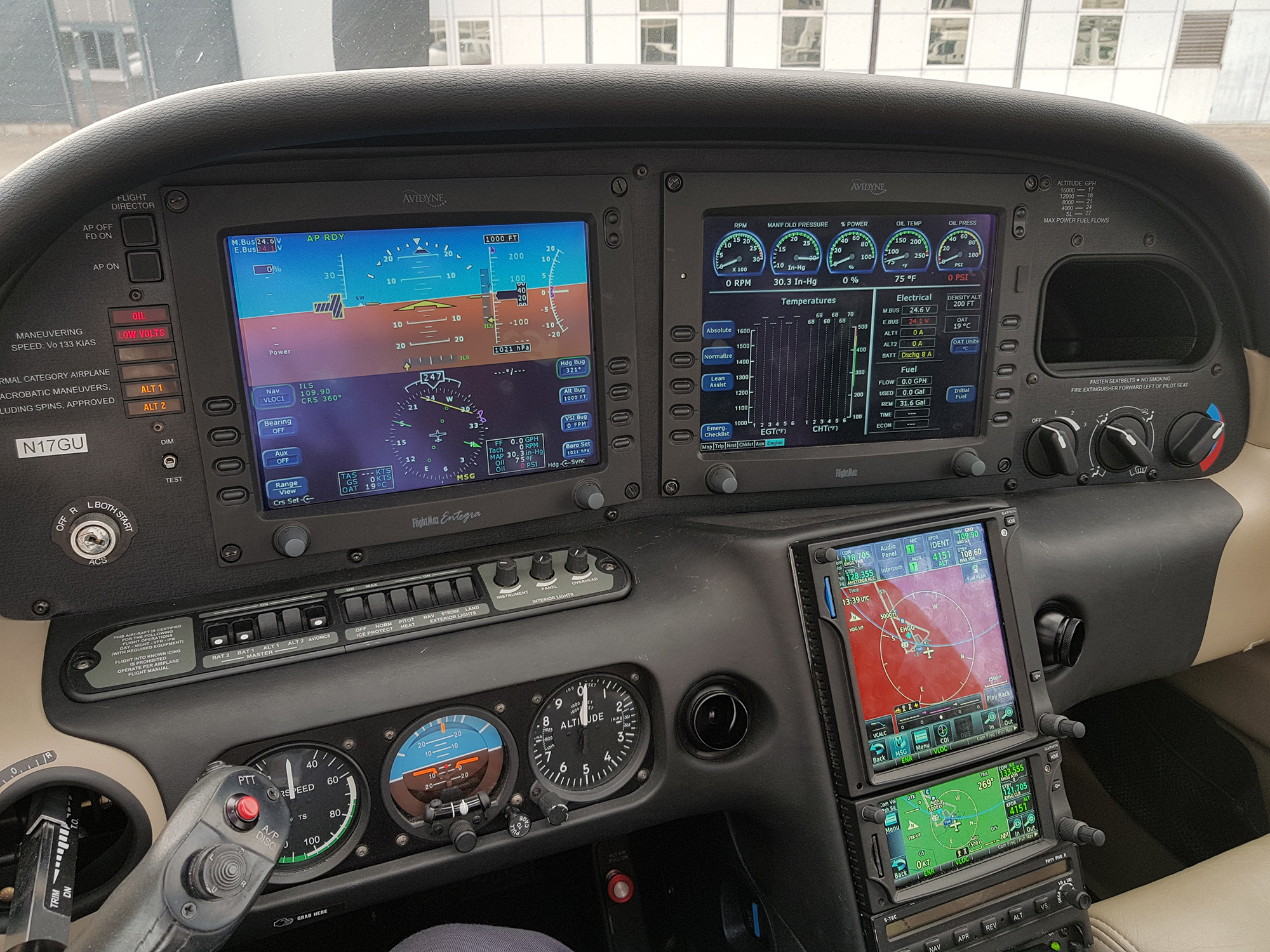De N17GU is voorzien van een Avidyne EFIS + Multi Function Display en een Garmin GTN 750 en Garmin GTN 650